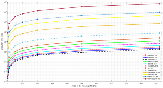 An extensive comparison was made to compare the performance efficiency of the proposed hash function with other lightweight hash functions such as Keccak-512, BLAKE-512, Grostl-512, JH-512, SipHash-64, Lesamnta-256, QUARK-256, Photon-256, and SPONGENT-256 according to execution time. We calculated the required execution time in ms to generate the hash values of messages with different sizes (1 KB to 1 MB) by taking the average of 1000 tests. The Lesamnta, QUARK, PHOTON, and SPONGENT functions have a long execution time for hardware-oriented structures. They are all based on the P-Sponge design, and only Lesamnta builds on the Merkle–Damgard design. Compared to other algorithms, the Grostl, JH, and SipHash functions have moderate execution times, placing them in the middle of the performance range. SipHash and JH have a similar structure, while Grostl uses the essential components from the AES. The Keccak winner of SHA-3 and BLAKE algorithms has the closest execution time with the proposed hash function. The proposed hash function is based on a fast and software-oriented block cipher structure that uses ARX operations. We achieved performance efficiency on the proposed hash function with a new hash construction utilizing a block cipher. Figure 9 shows the execution time comparison of lightweight hash functions, and all versions of the proposed hash function perform more efficiently than others.