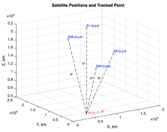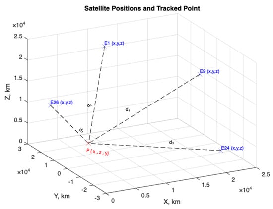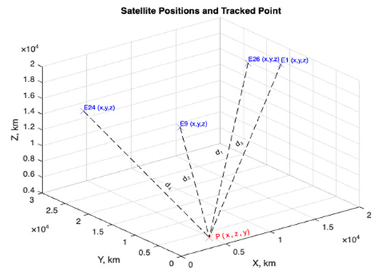 The Galileo system uses two basic principles to determine the position of the receiver: measuring the distance or the signal’s phase. Our research goal was to find out how measuring di-E, i = 1–4, affects the accuracy of determining the position of an unknown object P (see Figure 1). The accuracy of the Galileo system was evaluated using the telemetry method and based on Groebner’s algebraic approaches.