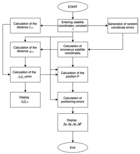 The flowchart of the calculation according to algorithms (1) to (33) is listed in Figure 2. First, the satellites’ coordinates were entered, and then, using the constant l, random errors were generated in the coordinates of the Galileo system satellites ΔXi, ΔYi, and ΔZi, i = 1–4 according to the relationship (28). Based on these errors, the fictitious position of each satellite was calculated, and the di–E pseudo-distances were determined according to relationship (32). The exact Di–E distances from the receiver to the satellites were determined according to the entered accurate coordinates for the satellites and point P. Subsequently, errors were generated measuring the distance Δ according to relationship (33). Then, the position of the user’s receiver P(x,y,z) according to the relationships (7) to (27) was determined. Errors in determining the position of the user’s coordinates P(x,y,z) were determined by comparing his exact coordinates P(x,y,z) and the calculated coordinates xc, yc, and zc according to relations (7) to (27):