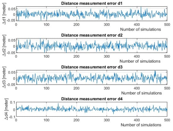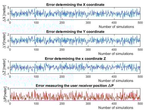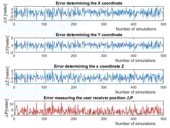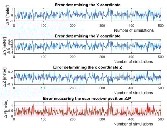 We checked how the errors Δ affect the calculation positions of the user’s receiver. The errors Δ were simulated using Equations (28) to (34). The distance determination errors were random for each satellite.