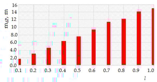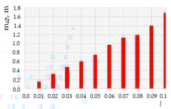 From Figure 4, we can conclude that even minor errors Δ significantly impact the accuracy of determining ΔP. If the errors Δ varied from −5.0 cm to 9.0 cm, then the error ΔP was from 0 to 1.2 m. Next, we changed the value of l and determined the coordinates’ errors ΔX, ΔY, ΔZ, and ΔP.