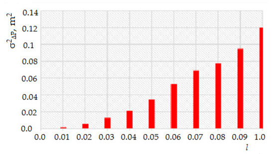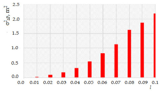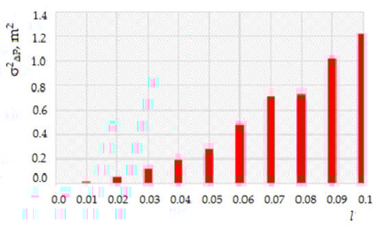 In this case, calculations confirmed that as Δ increased, the MVs of the receiver’s PDEs mΔP increased as well. During the simulations, the constant l was changed from 0 to 0.1, corresponding to the errors Δ from −0.4 m to 0.25 m. The MVs of the PDEs mΔP varied from 1.06 × 10−7 m to 0.72 m. The MSD of the receiver’s PDEs σ2ΔP, depending on the constant l, is shown in Figure 12.