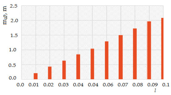 Calculations confirmed that as Δ (depends on k) increased, the MVs of the receiver’s PDEs mΔP increased. During the simulations, l was changed from 0 to 0.1, corresponding to the errors Δ from −0.4 m to 0.25 m. The MVs of the receiver’s PDEs mΔP varied from 1.94 × 10−8 m to 1.69 m. The mean square deviation (MSD) of the receiver’s PDEs depending on the constant l is shown in Figure 8.