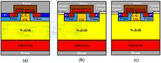 Schematic cross-sections for the (a) JBSFET, (b) MCDFET, and (c) JBS-MCDFET, respectively.
