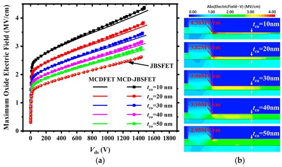 The Em_ox (a) characteristic curves and (b) distributions for MCDFET and MCD-JBSFET with different tco.