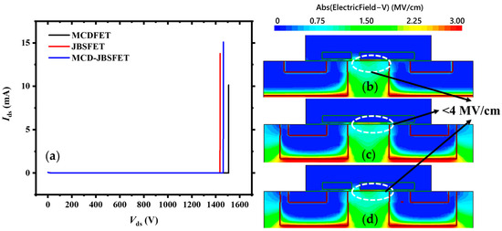 As shown in Figure 4a, breakdown voltages extracted at Ids= 5 mA/cm2 were 1495 V, 1434 V, and 1451 V for MCDFET, JBSFET, and MCD-JBSFET, respectively. These values are closed and all above 1200 V, ensuring reliable device performances. Meanwhile, avalanche points occurred at P-base/N-drift interface corners, while Em_ox did not exceed 4 MV/cm, indicating the good protection for both oxide and Schottky contact due to the narrow P-base regions, as shown in Figure 4b–d [12].