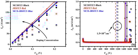 Figure 5a,b display the output and blocking characteristic curves for three types of devices at CSL doping concentration of 1 × 1016 cm−3, 5 × 1016 cm−3, and 1 × 1017 cm−3, respectively. In Figure 5a, the current conduction in devices with MCD structures improves as CSL doping concentration increases. When the doping concentration reached 1 × 1017 cm−3, the Ron measured at Ids = 100 A/cm2 was 1.07 mΩ·cm2, 0.98 mΩ·cm2 and 1.03 mΩ·cm2 for MCDFET, JBSFET, and MCD-JBSFET, respectively, with differences less than 10%. This can be attributed to the ability of CSL to horizontally stretch the current to flow across the JFET region uniformly, with this effect enhanced by the increase in the doping concentration, as shown in Figure 6a,b. Nevertheless, BVs exhibited a significant reduction with increasing CSL doping concentrations, as shown in Figure 5b. When CSL doping concentration reached 1.5 × 1017 cm−3, BVs for all devices dropped below 1200 V, no longer meeting design requirements. Thus, the 1 × 1017 cm−3 doping concentration of CSL is selected to obtain a favorable trade-off between BV and Ron.