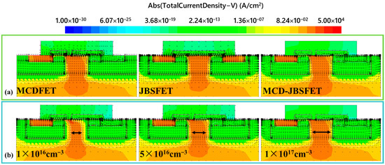 When Ids = 100 A/cm2, the forward conduction current distributions of (a) MCDFET, JBSFET, and MCD-JBSFET, and (b) MCD-JBSFET with CSL doping concentrations of 1 × 1016 cm−3, 5 × 1016 cm−3, and 1 × 1017 cm−3, respectively.