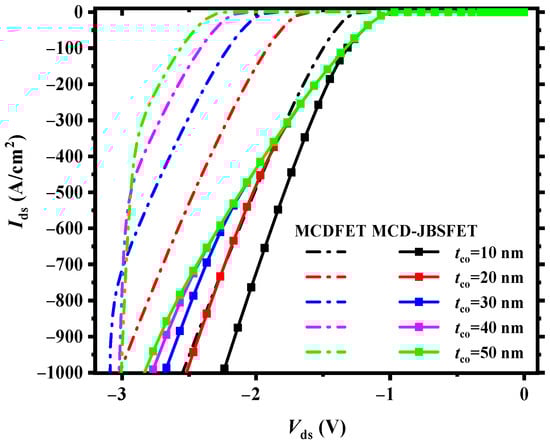 The reverse conduction characteristic curves for MCDFETs and MCD-JBSFETs with different tco.