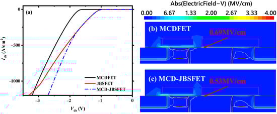 The reverse conduction characteristic curves of MCDFET, JBSFET and MCD-JBSFET are illustrated in Figure 8. The reverse conduction characteristic curves of JBSFET and MCD-JBSFET exhibited extremely similar behaviors until the Vds reached −1.63 V. At this voltage, the MCD in MCD-JBSFET was activated, allowing current to flow through both MCD and JBS paths, instead of solely through the JBS path, as shown in Figure 9. This mixed-conduction mode determined that the proposed device produced the lowest reverse on-state voltage (Vron) compared with the other two, with values of 2.46 V, 2.12, and 1.98 V for MCDFET, JBSFET, and MCD-JBSFET extracted at Ids = -500 A/cm2, respectively.