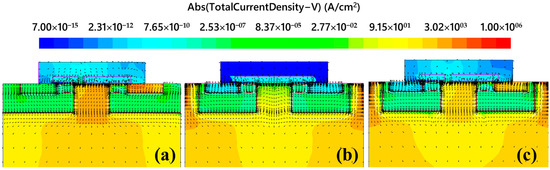 The distributions of reverse currents of (a) MCDFET, (b) JBSFET, and (c) MCD-JBSFET at Ids = −500 A/cm2.
