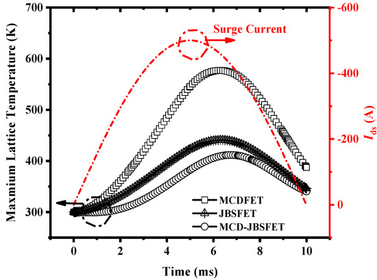Upon integration of JBS into MOSFET, the device can be operated in both forward and reverse conduction modes. Prolonged operation and high-current conditions, such as surge current conditions, can generate substantial heat accumulation, ultimately leading to lattice burnout or metal thermal failure, and thus threatening long-term reliability. To examine the surge current characteristics, three types of devices were subjected to a sinusoidal current source with a peak current of 500 A/cm2 and a cycle duration of 10 ms, while a Vgs of −5 V was applied to ensure MOSFET channel cut-off. The surge current behavior of each device is illustrated in Figure 10. When the peak current value reached 500 A/cm2, the maximum lattice temperatures were 577 K at 6.3 ms for MCDFET, 440 K at 6.1 ms for JBSFET, and 411 K at 6.7 ms for MCD-JBSFET, respectively. The MCD-JBSFET achieved the lowest lattice temperature, indicating the improvement of resistance to surge current. Figure 11 gives the maximum lattice temperature distributions across different devices. Due to the largest reverse conduction voltage drop and lower channel carrier mobility, the MCDFET exhibited hot spots concentrated in the MCD, resulting in the highest maximum lattice temperature among the three types of devices, while the JBSFET exhibited its peak temperature at the Schottky contact. This is because the JFET region beneath the JBS typically has lower doping concentration and narrower width to ensure blocking characteristics, leading to higher resistance and increasing thermal energy generation under identical current conditions (Q = I2Rt in simple terms). Nevertheless, the introduction of the MCD structure in JBSFET, e.g., MCD-JBSFET, redirected current to through both JBS and MCD, addressing issues caused by the MCD structure and avoiding bipolar degradation induced by triggering CUGP.