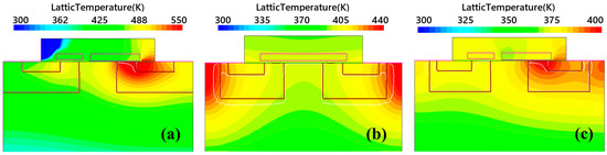 The distributions of maximum lattice temperature for (a) MCDFET, (b) JBSFET, (c) MCD-JBSFET at Ids = −500 A/cm2.