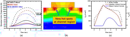 When the surge peak current raised from 500 A/cm2 to 1000 A/cm2, the maximum lattice temperature differences between three types of devices became more pronounced. The peak values of lattice temperature for MCDFET and JBSFET reached 1187 K and 1045 K, respectively, which exceeded the safe operating area of the metal, such as Al, which melted at 933 K, as shown in Figure 12a. For JBSFET, a new hot spot was observed at the channel region at Ids = −1000 A/cm2, as marked in Figure 12b. With the increase in the surge current, the JFET region under the JBS experienced elevated lattice temperature, resulting in the enhancement of the lattice vibration scattering, decreasing the mean free path, and incurring velocity saturation. When the surge current reached −800 A/cm2, the current started to flow through the ohmic contact and channel into the drift region, as depicted in Figure 12c. In the mix-conduction mode of MCD-JBSFET, the peak value of lattice temperature consistently remained below 900 K, even when the current reached 1000 A/cm2, indicating superior high-temperature robustness.