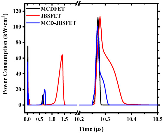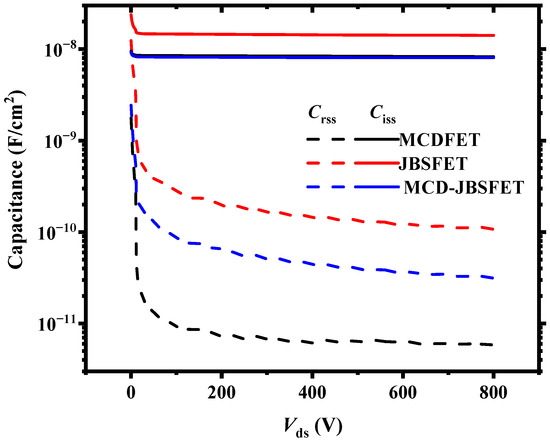 The capacitance properties of three types of devices are illustrated in Figure 13. At Vds = 800 V, the input capacitances (Ciss) were extracted at 8.3 nF/cm2, 14.1 nF/cm2, and 8.1 nF/cm2, whereas the reverse capacitances (Crss) were 5.9 pF/cm2, 107.8 pF/cm2, and 31.4 pF/cm2 for MCDFET, JBSFET and MCD-JBSFET, respectively. Compared to JBSFET, introducing the MCD structure results in an obvious 65.5% reduction in Crss by removing gate polysilicon above the JFET region. Additionally, the dummy gate reduced gate-to-source contact area, leading to a notable 42.5% decrease in Ciss.