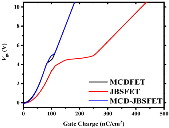 These capacitance reductions have a favorable impact on gate charge properties. Figure 14 gives the curves of gate charge (Qg) characteristic of three types of devices with values of 176 nC/cm2, 421 nC/cm2, and 176 nC/cm2 extracted at Vgs = 10 V for MCDFET, JBSFET, and MCD-JBSFET, respectively. The corresponding gate-to-drain charge (Qgd) values are 18 nC/cm2, 96 nC/cm2, and 16 nC/cm2 for the respective devices. Consequently, the figures of merit for Ron × Qg and Ron × Qgd were improved by a factor of 2.15 and 5.39 for JBSFET by introducing the MCD structure, respectively.