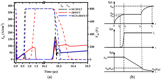 Figure 15a,b depict the switching characteristics for the devices with different structures and corresponding ideal turn-on switching waveforms. Simulations were conducted with an 800 V bus voltage and a gate pulse voltage ranging from 0 V to 15 V, as suggested by traditional 1200 V SiC MOSFET standards. It is evident that JBSFET exhibited the poorest switching performances, which could be attributed to the following reasons: (a) 0~t1 period: the larger Ciss of JBSFET required more time to charge to reach threshold voltage; (b) t1~t2 period: JBSFET took the most time to achieve the highest saturate current compared with the other two due to its double channel current density; and (c) t2~t3 period: JBSFET has the largest Crss and Qgd, resulting in the lowest di/dt and an extended discharge time. These reasons are also suitable for the turn-off processes. Finally, the turn-on energy losses (Eon) calculated from Figure 16 were 1.43 mJ/cm2, 5.61 mJ/cm2, and 2.18 mJ/cm2, whereas the turn-off energy losses (Eoff) were 0.7 mJ/cm2, 3.52 mJ/cm2, and 1.49 mJ/cm2 for MCDFET, JBSFET, and MCD-JBSFET, respectively. Adopting the MCD structure markedly improved the switching performance of the JBSFET, reducing total switching losses by 40.2% due to its improved capacitance and gate charge characteristics. Detailed electrical parameter values are illustrated in Table 2.