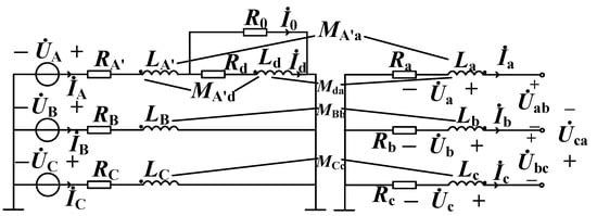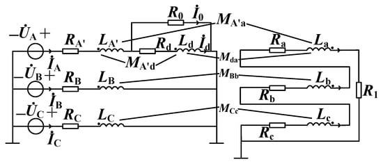 Figure 2 illustrates the equivalent circuit of a three-phase voltage transformer during an A-phase fault. In this circuit, RA’ represents the resistance of the winding in the non-short-circuited portion of phase A on the primary side, while LA’ denotes the inductance of the winding in the non-short-circuited section of phase A on the primary side. Rd is the resistance of the winding in the short-circuited part of phase A on the primary side, Ld is the inductance of the winding group in the short-circuited part of phase A on the primary side, RB and RC are the resistances of the windings on the phases B and C, LB and LC are the inductances of the windings in the B and C phases, UA, UB, and UC are the three-phase voltage sources, Ra, Rb, and Rc are the resistances of the windings in the secondary side, and La, Lb, and Lc are the inductances of the windings in the secondary side. MA’d represents the mutual inductance LA’ and Ld, whereas MA’d, Mda, MBb, and MCc indicate the mutual inductance between different inductors. R0 is 10−8 Ω, which signifies a short circuit. , , , , , and correspond to the currents of each phase on the primary and secondary sides, respectively.