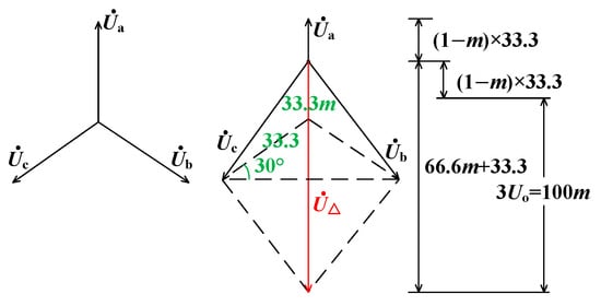 The zero-sequence voltage calculation adopts the vector method, as shown in Figure 4. When there is a turn-to-turn short circuit in phase A, the red line segments represent the synthesized vector formed by and . Since this vector is in the opposite direction to , the length of the three-phase composite vector is obtained by subtracting from the composite vector of and . The length of the synthesized vector of the three-phase voltage is 100 m, which also corresponds to the magnitude of the zero-sequence voltage :