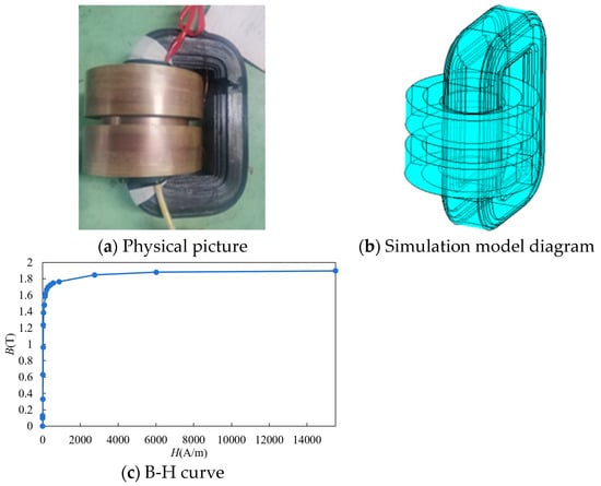 In 10 kV distribution systems, where ungrounded neutral point operation is prevalent, ferro resonance overvoltage poses a significant concern, particularly when utilizing semi-insulated voltage transformers, which are more susceptible to this risk. In contrast, fully insulated voltage transformers, owing to their distinctive design and harmonic suppression capabilities, can effectively mitigate this problem, thereby ensuring the stability and safety of the system. Fully insulated voltage transformers not only fulfill the high reliability and precise metering requirements of 10 kV systems but also provide distinct advantages in terms of harmonic suppression, grounding methods, and tolerance to single-phase grounding voltage. In this paper, based on the actual conditions of the Three Gorges Power Plant, the JDZ-10 voltage transformer is selected for discussion. This model is a fully insulated voltage transformer commonly used at the 10 kV voltage level and is considered representative. The high-voltage winding (primary side) consists of a total of 17,470 turns wound around an epoxy resin cylinder and is divided into two sections. The low-voltage winding (secondary side) comprises 175 turns wrapped in insulating tape to prevent short circuits between the high and low-voltage windings. The low-voltage winding is located on the inner side, while the high-voltage winding is positioned on the outer side, as illustrated in Figure 5a. The geometric parameters of the voltage transformer are detailed in Table 1, and a corresponding 3D finite element simulation model has been constructed based on these parameters, as depicted in Figure 5b. The electrical parameters are presented in Table 2. The B-H curve is illustrated in Figure 5c, where the first half of the magnetic circuit remains unsaturated, and the relationship between B and H appears to be linear. The magnetic permeability is high and remains relatively constant. As the magnetic induction magnitude (B) increases to a certain level, the magnetic circuit begins to saturate, resulting in an increase in magnetic field intensity (H). However, the change in magnetic induction magnitude becomes minimal, and the magnetic permeability decreases significantly.