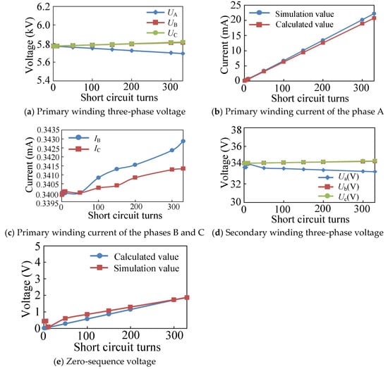 From Figure 10, it is evident that when the primary winding of phase A is short-circuited between turns, the voltage on the primary side of phase C is the highest, while the voltage of phase A is the lowest. The phase with the next highest voltage is identified as the faulty phase. The voltage of phase B falls between that of phases A and C, and the variation in the three-phase voltage on the secondary side aligns with the three-phase voltage on the primary side. The fault phase current continues to rise as the number of short-circuit turns increases, and the calculated values correspond with the trends observed in the simulation results. Both the calculated and simulated values of zero-sequence voltage exhibit an upward trend as the number of short-circuit turns increases. However, it is important to note that finite element software cannot achieve ideal conditions when the number of short-circuit turns is very small, leading to a significant proportion of software errors. Consequently, the errors in the fault phase current and zero-sequence voltage are relatively large. Nevertheless, as the number of short-circuit turns gradually increases, the proportion of error decreases. For instance, when the number of short-circuit turns reaches 330, the error in the fault phase current is only 6.3%, while the error in the zero-sequence voltage is merely 1.6%.
