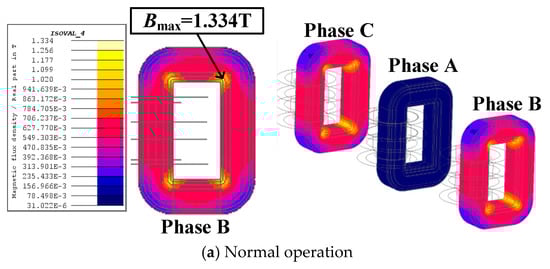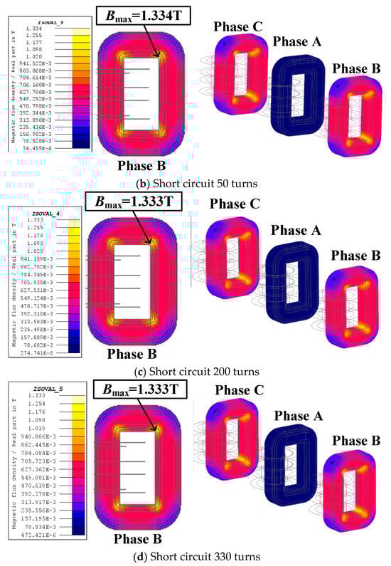 From Figure 11, it can be seen that during normal operation, the magnetic induction magnitude of phase A is relatively low, and the magnetic cores of the three phases have not saturated. The magnetic induction magnitude at the yokes of phase B and phase C is relatively high, but the highest is only about 1.334 T. Therefore, the transformer can operate normally at this time. As the number of short-circuit turns increases to 330, the magnetic induction magnitude of phases A, B, and C remains basically unchanged. This is because the number of short-circuit turns is too small. If the number of short-circuit turns continues to increase to a certain extent, saturation will occur at the iron yoke.