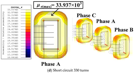 Figure 13 shows the distribution cloud diagram of relative magnetic permeability during turn-to-turn short circuits. During normal operation, the relative magnetic permeability of the iron core is symmetrically distributed, with a maximum value of 33,937. When a short circuit occurs across 50 turns, the relative magnetic permeability on both sides of the air gap remains essentially unchanged. Even with a short circuit across 330 turns, the relative magnetic permeability distribution did not change significantly, with only a slight decrease in phase A. This is because the number of short-circuit turns is too small, and phase A has not entered saturation currently. But, as the number of short-circuit turns continues to increase to a certain extent, phase A gradually enters saturation, and the relative magnetic permeability of phase A iron core will decrease significantly. However, because the current of B and C phases is basically unchanged, the relative permeability of the core is still maintained at a high level.