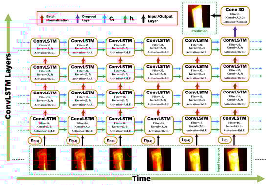In a ConvLSTM cell, matrix multiplication at each gate of classical LSTM is replaced with convolution operation. Comparing Equation (A2) with Equation (A3), the only difference is the utilization of convolutional operation ‘*’ instead of multiplication ‘·’ in gate sub-layers. In Figure A3, you can see the structure of one ConvLSTM layer.