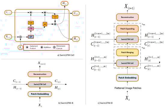 The architecture of SwinLSTM is outlined in Figure 2, introducing two model variations: SwinLSTM-B and SwinLSTM-D. Figure 2a shows the fundamental SwinLSTM cell structure, whereas SwinLSTM cell integrates Swin Transformer blocks (STB) with a simplified LSTM structure around the one for enhanced spatiotemporal representation. The LP block in the structure denotes linear projection. Patch embedding is the process of dividing an image into smaller sections, transforming these sections into a series of vectors, and adding positional information to help a model understand the spatial relationships within the image. In SwinLSTM architectures, input images are passed through a patch embedding layer prior to SwinLSTM cells. This way, input images are transformed into sequences of patches to extract spatiotemporal features. Figure 2b illustrates the architecture of a SwinLSTM-B model that utilizes a single SwinLSTM cell. As explained, using SwinLSTM-B, the input image at the current time is divided into patches, embeds these patches, and then processes them through the SwinLSTM cell alongside the previous time step’s hidden and cell states (respectively, and ). The output is then decoded by a reconstruction layer to predict the next frame. Figure 2c shows SwinLSTM-D architecture. It expands on the base model by incorporating multiple SwinLSTM cells and including Patch Merging and Patch Expanding layers for downsampling and upsampling, respectively. This design facilitates processing across different scales by using hidden and cell states (respectively, and , which l denotes the number of the layer) of previous time steps and layers outputs, enhancing the model’s ability to capture complex spatiotemporal dynamics. SwinLSTM-D follows a similar process to SwinLSTM-B, but with added complexity for handling multi-scale spatiotemporal information.