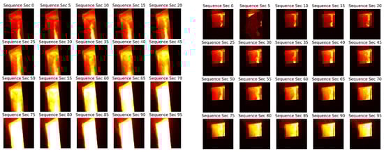 To train LSTM-based deep learning models for this study, we created various video datasets using thermal infrared (IR) video frames recorded by a FLIR T650sc camera during several full-scale room fire test experiments [2]. The details of the room set-ups and fire tests are provided in [2]. IR video data were first re-scaled into smaller sizes: 16 × 16, 32 × 32, 64 × 64, and 128 × 128. However, following the architecture of the original SwinLSTM work [26], we used videos with the size of 64 × 64 in our test experiments. After re-scaling and calculating the frame rate of raw IR videos captured from room fire test experiments, we retained one frame per second for generating training and testing videos while ensuring that all critical events were included in our datasets. We normalized the entire dataset using Min-Max normalization, and then separated the dataset into small video batches. The new datasets are tensors containing short-duration videos (i.e., 20 s, 30 s, 50 s, and 100 s in length). In this way, we made 16 various spatial and temporal datasets (with different scales and time durations). Again, following the common video size in the literature [21,26], we selected the 20 s dataset for training and testing in this study. In general, the dataset we used for training and testing of our deep learning models had a tensor of length 3338 × 20 × 64 × 64 × 1. We randomly separated the dataset into 70%, 20%, and 10% for training, validation, and test purposes, respectively. Figure 3 shows two random sample data from our generated dataset. Note that the frames selected every 5 s mean that we are looking at a video of size 95 s. We did this to increase the variation between frames of videos in order to force models to learn images with higher amounts of variations, resulting in better model generalization.