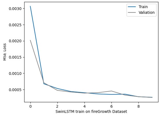 In order to train the LSTM-based models for evaluation and comparison, we implemented each model using the PyTorch library. We trained models for 10 epochs with a batch size of 16 using one NVIDIA Tesla K80 and 16 GB of Memory. The Adam Optimization [31] is used as the optimizer with its default parameters utilizing binary cross-entropy as the loss function. As a random illustration of one training trend of SwinLSTM architecture, Figure 4 shows that SwinLSTM architecture almost converged after a few epochs using our experimental setup regarding the trend of mean square error (MSE) as the criteria for training performance.