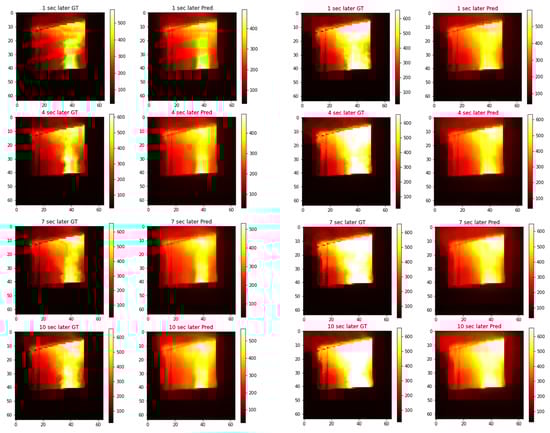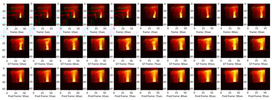 We applied the trained SwinLSTM deep learning models for the test datasets that we collected and created, containing 338 fire content video IR data from different room fire test experiments. In Figure 5, the top row is ten past seconds, and the second row is ten seconds of the future (i.e., ground truth frames). The third row is the prediction results of SwinLSTM for ten seconds in the future. From the figure, it is clear that SwinLSTM is capable of generating future frames that include fine details and subtle changes in the image. For instance, the location of the window was not fixed in the experiments, but the model can predict that accurately. It is observed that the loss of details from the future frames is inevitable for the three models; however, SwinLSTM generates future frames with more details regarding the flame heights compared to the ground truth frames.