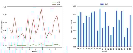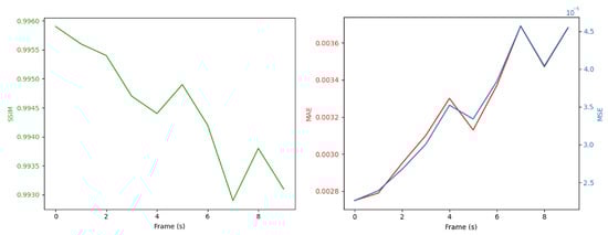 where x and y are the compared prediction and ground truth images, and represent the average intensities of x and y images, and represent the variance of x and y, is the covariance of x and y, and and are constant. We also reported MSE and Mean Absolute Error (MAE) as other metrics between predicted and ground truth frames (see Equations (2) and (3)). A simple explanation for these metrics is that MAE and MSE measure the average and variance of the residuals between predicted and ground truth images, respectively.