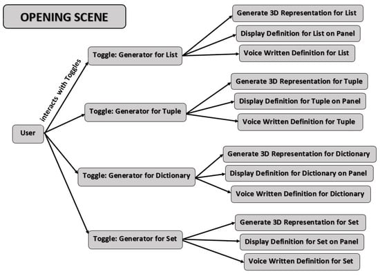 Ref. [10] suggested that the widespread availability of large datasets and the progress in AI, along with VR technology, can generate fresh opportunities and challenges that can be effectively harnessed for educational purposes and learning. They also suggested that a one-size-fits-all approach should be adopted in content delivery. For this reason, while designing the content of the developed application, we pay attention to the adaptability of the basic logic to other fields and flexibility for individual learners in case the people who may use the content have different levels of knowledge.