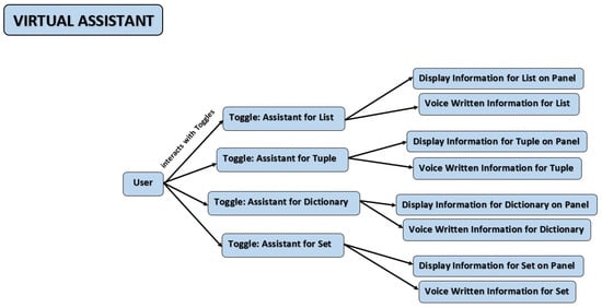 Firstly, the virtual assistant is located on the left side of the application. When the user activates any of the designed toggles—‘Assistant for List’, ‘Assistant for Tuple’, ‘Assistant for Dictionary’, and ‘Assistant for Set’, the virtual assistant writes and voices information related to the respective data type. Each time these toggles are pressed, another piece of information about the relevant data type is presented. In a way, the logic of text-to-speech (TTS) conversion, one of the fundamental purposes of using the Meta Voice SDK, is combined with toggle interaction. In other words, after interacting with the toggle, the feedback from the virtual assistant is both written and vocal.