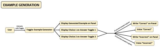 While Figure 1 shows the elements used in the development of the VR application, Figure 2, Figure 3, Figure 4 and Figure 5 show the four basic parts that make up the content of the application, opening scene, virtual assistant, main question-answering block and example generation, and shows how they work in order when the user interacts with these elements in the application and what happens as a result of the interactions.