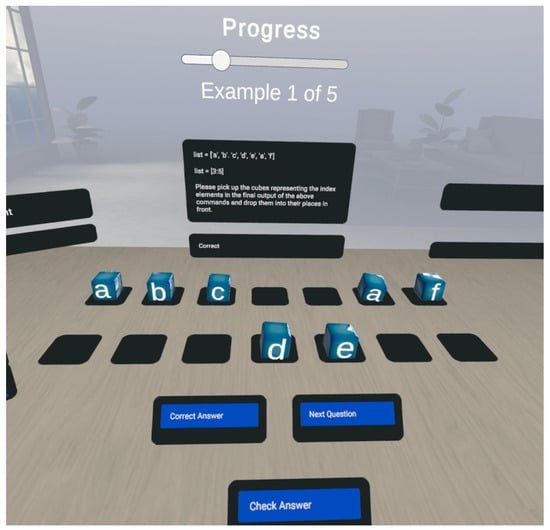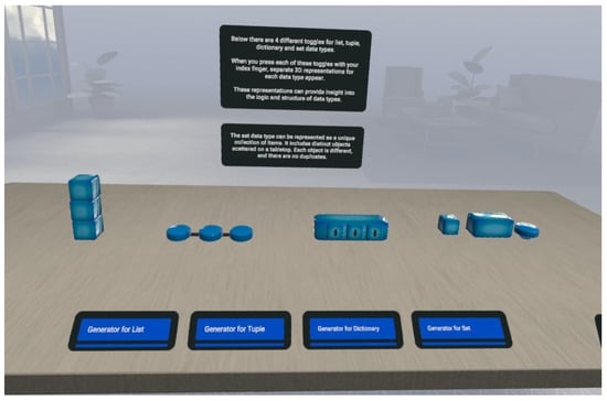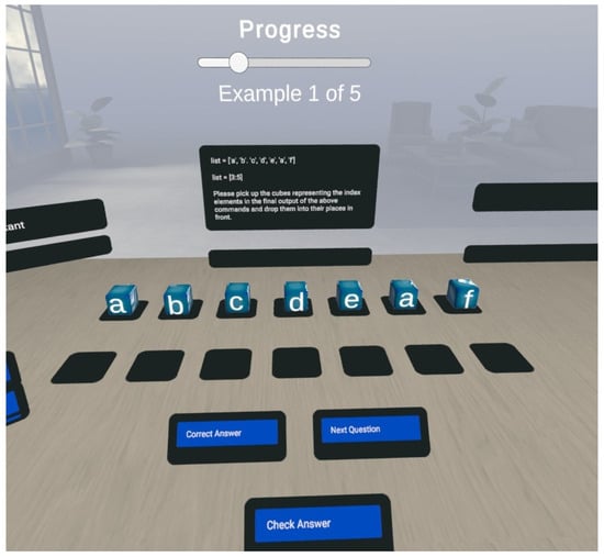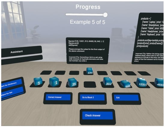 Ref. [23] showed that teachers and developers can improve the quality and personalisation of these systems. Applying a more organised approach to evaluating and personalising VR/AR/MR learning systems can enhance their suitability and effectiveness for learners’ specific needs. As such, we integrate personalised learning into our VR application so that new and different Python collection data types examples can be generated based on the existing examples within the application. Additionally, the application consists of three sets of questions at varying difficulty levels—easy, medium, and hard—to cater to users with different levels of knowledge and backgrounds.