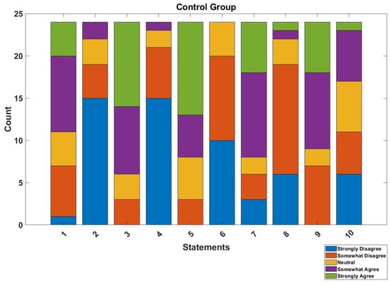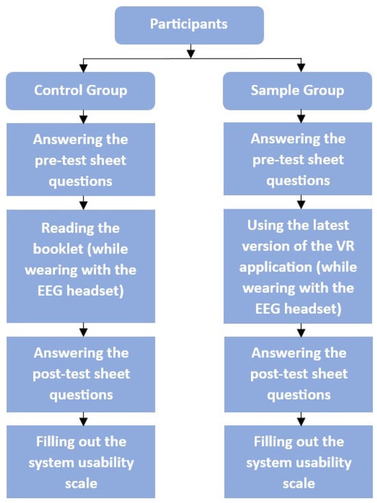 - Hypothesis 3 (H3): Participants in the sample group will show higher levels of engagement, as measured by EEG, compared to the control group.Justification 3: VR technology provides an immersive learning environment that can captivate users’ interest more effectively than traditional learning methods. The three-dimensional, interactive nature of VR allows learners to experience the subject matter more engagingly, leading to higher levels of engagement. This hypothesis is based on the notion that immersive technologies like VR stimulate more senses than reading a booklet, translating to increased motivation and interest in the learning content. EEG measurements of engagement, such as those assessing cognitive workload and emotional arousal, are expected to reflect this enhanced engagement among VR application users compared to booklet readers.
