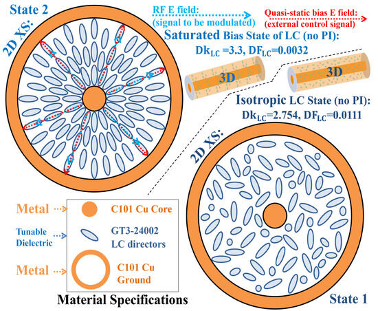 A key feature of liquid crystal (LC)-based devices is their inherent anisotropy, which arises from the nanoscopic anisotropy of the LC molecules and manifests macroscopically as dielectric permittivity anisotropy [18,19]. This variation in dielectric properties, induced by molecular anisotropy, is achieved through the application of a low-frequency external voltage field, specifically a quasi-electrostatic bias field for dynamic control. By adjusting the bias voltage from a reference state (e.g., 0 V in many cases) to a saturation point—at which the dielectric properties stabilize despite further increases in the applied field—the tunable characteristics of the device can be continuously controlled between these two extreme states, as illustrated in Figure 1 for the two-dimension (2D) cross-sectional (XS) and three-dimension (3D) longitudinal views.