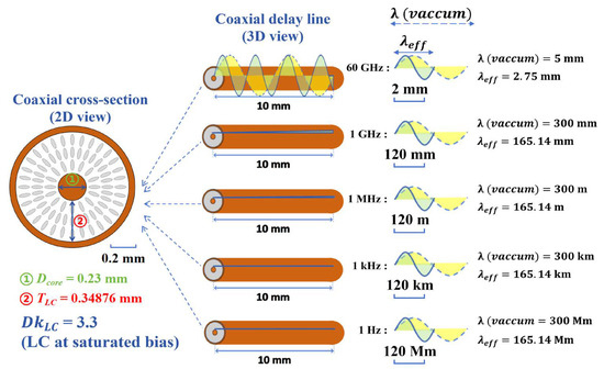 - Finally, designing the geometry based on the highest frequency point (60 GHz) amplifies the LFB vulnerability. For long-wavelength applications (e.g., 1 Hz, 1 kHz, and 1 MHz as listed in Table 1), the TLC (0.34876 mm) and Dcore (0.23 mm) dimensions, optimized for the 60 GHz standard, offer a highly area-efficient solution to the 50 Ω impedance-matching equation. However, LFB may still occur in full-wave computational simulations, as the wave-like behavior becomes infinitesimally small relative to the tiny structure. The multi-scale evolution of the LFB susceptibility is intuitively schematized in Figure 2. The multiple frequencies presented in this study correspond to the transmitted signal (or low-frequency biasing signal) undergoing phase shifting and subsequent analysis through simulations, where the quasi-static or low-frequency bias cannot be simulated independently (separately). It is crucial to carefully assess the potential computational impact (e.g., LFB errors) of the liquid crystal (LC) material’s low-frequency bias on the simulation of the transmitted signal across various frequencies, in addition to the practical coupling effects (crosstalk) between the mixed signals and the influence of noise from instrumentation.