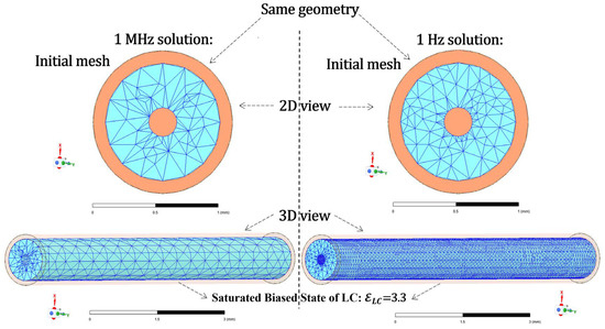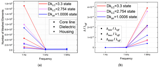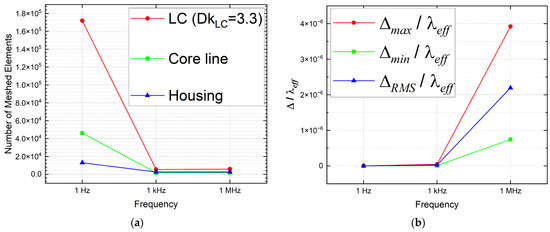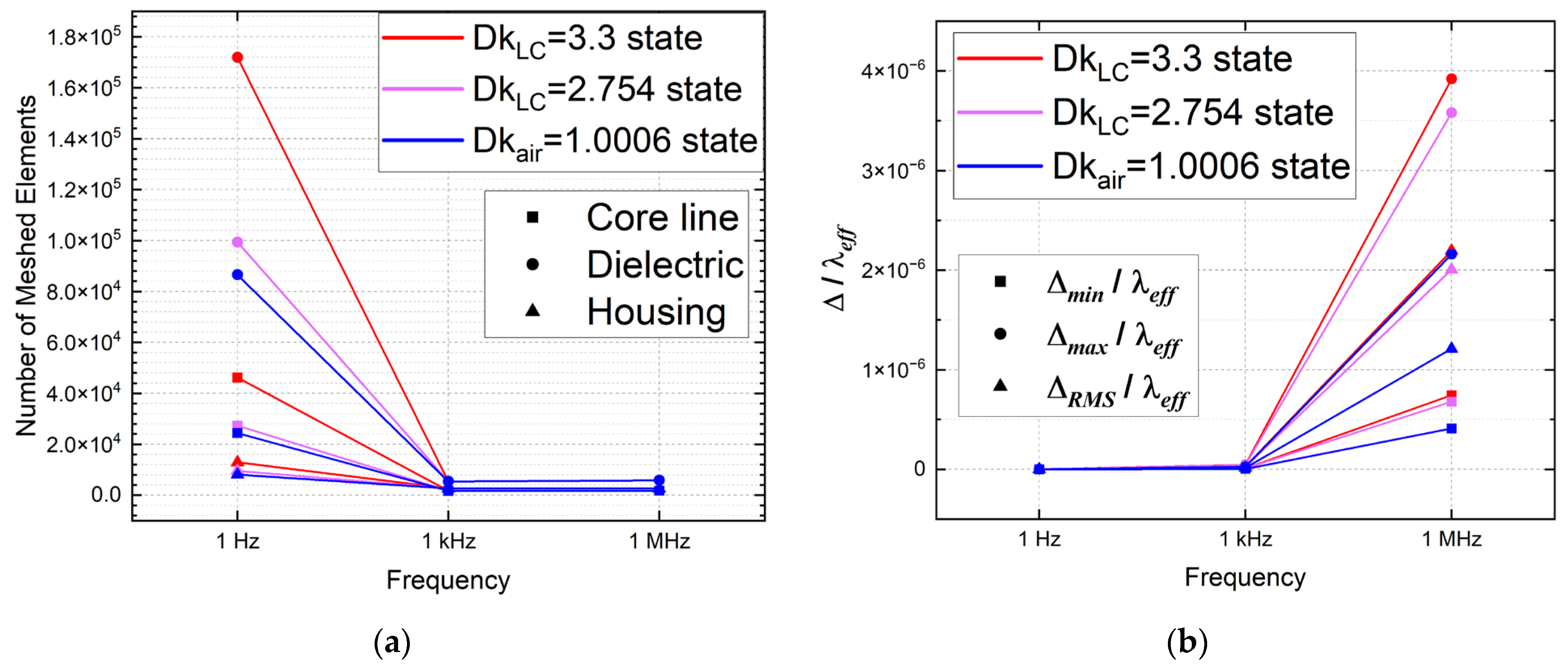 Meshing statistics are further compared across three potentially vulnerable frequency cases: 1 MHz, 1 kHz, and 1 Hz. Figure 3a illustrates the number of meshed elements at the surfaces of the core line, the housing conductor, and within the volume of the dielectric, i.e., liquid crystal (LC). Two primary phenomena are observed. First, there is a significant increase in the number of meshed elements when the solution frequency is decreased from 1 kHz to 1 Hz, while the change is minimal when the frequency is reduced from 1 MHz to 1 kHz. Second, the volume of the LC dielectric consistently accounts for the majority of meshed elements across all three frequency points, particularly evident in the 1 Hz case. This is followed by the number of meshed elements at the surface of the core line, with the grounding conductor exhibiting the least number. Notably, the difference in the number of meshed elements across the constitutive materials is minimal for both 1 kHz and 1 MHz.