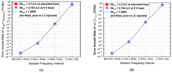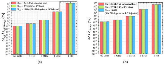 To evaluate the occurrence of low-frequency breakdown (LFB), we incorporate two critical electromagnetic parameters—effective permittivity () in Figure 5a and characteristic impedance (Z) in Figure 5b—into the benchmarking analysis against theoretical values, i.e., and , respectively. The prediction errors for both and Z vary by frequency, generally increasing as the frequency decreases. The most significant increase in errors occurs between 1 MHz and 1 kHz, with errors continuing to rise as the frequency drops further from 1 kHz to 1 Hz. Specifically at 1 kHz, the prediction error in dramatically amounts to the level of 1.5 × %, and the error in Z surges to the level of 1.15 × %. At 1 Hz, the errors further rise to the levels of 1.5 × % and 3.9 × % for and Z, respectively. These results suggest that errors in the computed cross-sectional properties, or modes, propagate into the scattering matrix (S-parameters), which links the input and output modes. However, the dependency of these errors on the tuning states is relatively minor compared to the significant influence of frequency dependency.