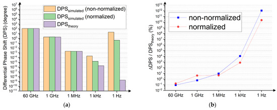 Results of differential phase shift (DPS) at five discrete frequency points under examination: (a) Comparison of simulated values (both normalized and non-normalized to 50 Ω) with theoretical values; (b) Prediction errors in percentage. Logarithmic scale applied to both vertical axes.