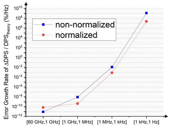 As illustrated by the DPS pattern in Figure 9, the prediction error (using the normalized result as an example) is minimal at 60 GHz, with a value of 0.16%, and begins to become noticeable at 1 MHz with an error of 4.39%, then increases sharply to 743.88% at 1 kHz, and escalates dramatically to 2.18 × % at 1 Hz. The error growth rate, expressed as percentage per Hz, is depicted in Figure 10, highlighting a continuously increasing trend as the frequency decreases from the gigahertz (GHz) range into the low-frequency breakdown (LFB) regime (MHz, kHz, and Hz). These DPS deviation results are consistent with the cross-spectrum performance predictions of the cross-sectional properties presented earlier in Section 3.2 and further demonstrate the frequency-asymmetric error growth pattern in the LFB regime from 1 MHz down to 1 kHz and 1 Hz.
