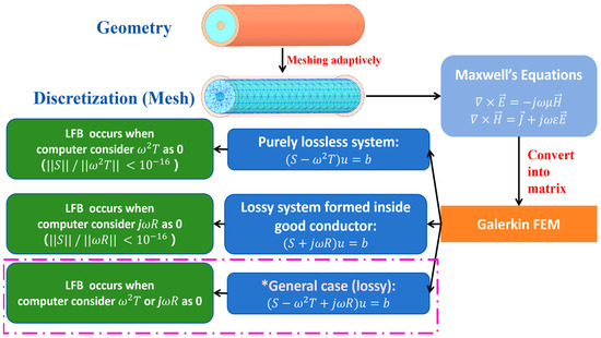 Figure 11 outlines the characteristics of LFB specific to the Galerkin FEM solution, where ω denotes the angular frequency, S is the stiffness matrix (coefficient matrix), T is the mass matrix, R is the conductivity-related mass matrix, and b is the excitation vector. (See Appendix A for detailed mathematical formulations [37]). The matrix norm is represented by the function ‖·‖ and is used to assess LFB ratios. The discussion encompasses three cases: a purely lossless system, a lossy system within good conductors, and a generally lossy system (with non-ideal dielectrics and conductors), as examined in this work using the LC-filled coaxial phase shifter.