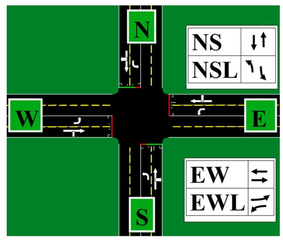 A traffic network can be represented as a directed graph H = (P, Q), where p ∈ P represents an intersection and denotes the adjacency and connection between two intersections. The neighborhood of junction p is denoted as , and the degree of an intersection is the size of its neighborhood. represents the minimum number of sides connecting the two junctions and . Each intersection has two types of lanes: entrance lanes, where vehicles enter the intersection, and exit lanes, where vehicles leave. An intersection consists of multiple entry and exit lanes. The set of entry lanes at an intersection is denoted as . Traffic flow is defined as a combination of an entry lane and an exit lane. A phase refers to the combination of traffic flows that are set to green during a signal cycle. For example, as shown in Figure 2, an intersection may have four phases: North–South Straight (NS), North–South Left Turn (NSL), East–West Straight (EW), and East–West Left Turn (EWL).