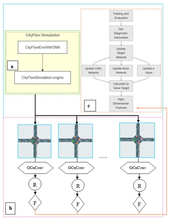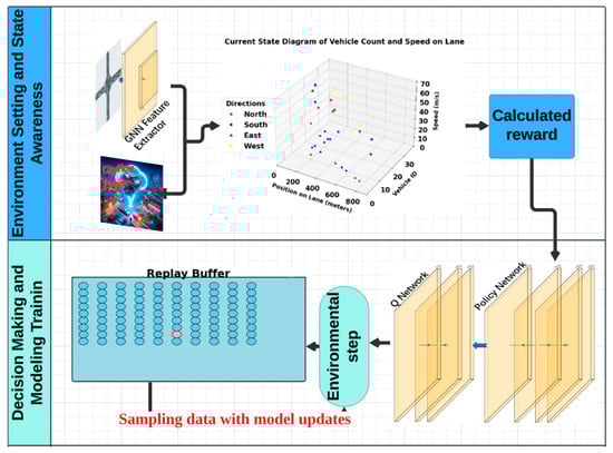 This study proposes an adaptive traffic signal control algorithm based on GNN and the dynamic entropy-constrained Soft Actor–Critic (DESAC) algorithm. The overall framework of the algorithm is shown in Figure 3. The simulation environment and data transfer interconnect the modules, enabling dynamic optimization of traffic signals for both single and multiple intersections. This approach takes into account not only the state of individual intersections but also the broader context of the surrounding intersections. The system consists of several key components.