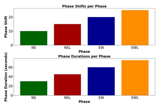 The action space in our model consists of two components: phase shifts and phase durations. Phase Shifts: Represent the change in signal phases, determining which lanes are open for passage at a given time. Phase Durations: Specify how long each phase remains active, controlling the duration of each traffic signal phase. At each time step, the environment updates the state of the traffic light based on a given phase transition and phase duration. An example of the action representation is shown in Figure 5.