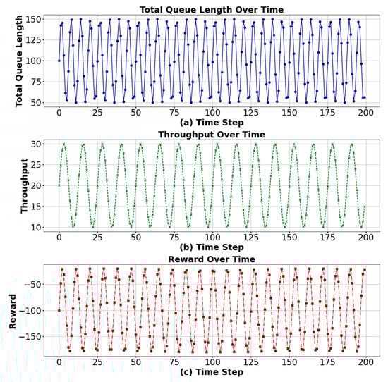 We set the total reward to a combination of negative queue length and throughput, with the throughput weighted at 10. This reward structure is designed to optimize overall system performance by encouraging the algorithms to balance congestion reduction with processing efficiency. The simulation results are shown in Figure 11a and Figure 12a.