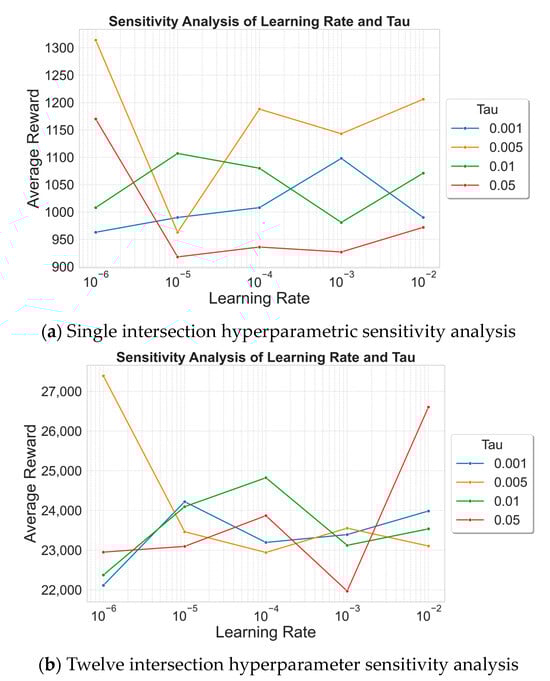 Additionally, several studies have focused on enhancing the performance of DRL in traffic signal control (TSC) through data-driven innovations and algorithmic advancements. Xu et al. [27] proposed a data-driven framework for identifying and optimizing key nodes in a traffic network, significantly improving access efficiency and reducing delays. Zhao et al. [28] introduced a heterogeneous Graph Neural Network model that integrates a dual-attention mechanism with DRL, enhancing the scheduling efficiency of intersections. Mao et al. [29] applied the Soft Actor–Critic (SAC) algorithm to TSC for the first time, demonstrating its superior adaptability and performance compared to other methods. Fuad et al. [30] developed an adaptive TSC algorithm based on deep Q-networks, combined with a macro fundamental graph and an exponential rewarding mechanism to significantly improve traffic flow. Zai et al. [31] incorporated an efficient channel attention mechanism, LSTM, and double dominance DQN to enhance cumulative rewards, reduce queue lengths, and lower CO2 emissions. Zhang et al. [32] proposed an Adaptive Traffic Signal Priority (ATSP) model that integrates single and multiple request modules to optimize the efficiency of both public transport and private vehicles.